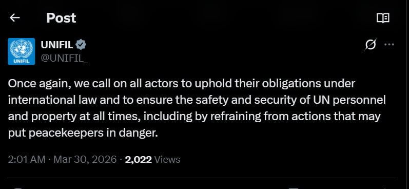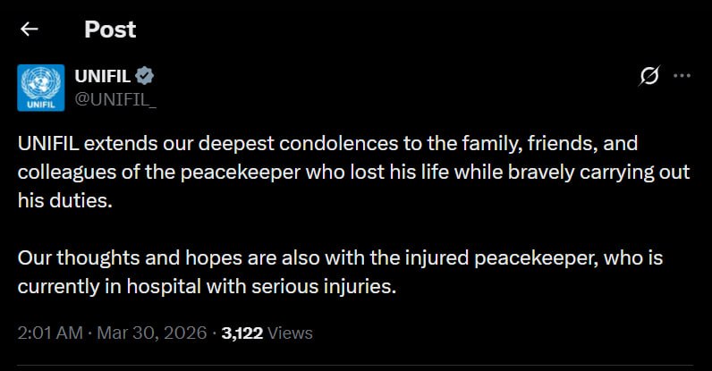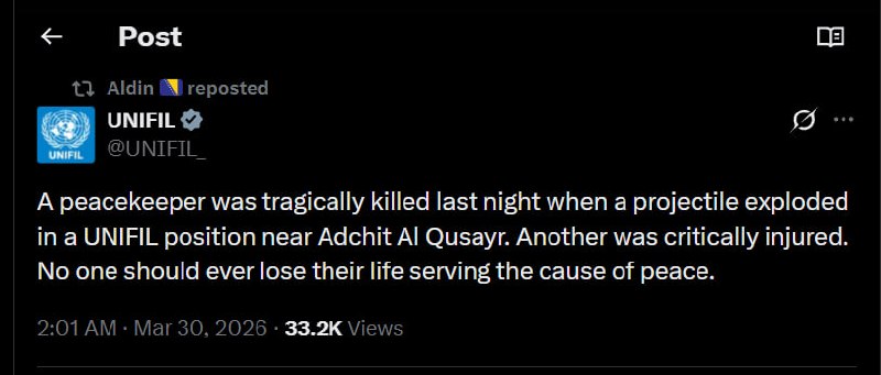 UNIFIL suffered casualties when a projectile exploded near Adchit al‑Qusayr, killing one peacekeeper and injuring another (BellumActaNews). Earlier, Israeli artillery struck a UN peacekeeper base in southern Lebanon at 20:25 UTC, raising concerns about the safety of international forces operating in the buffer zone (source).