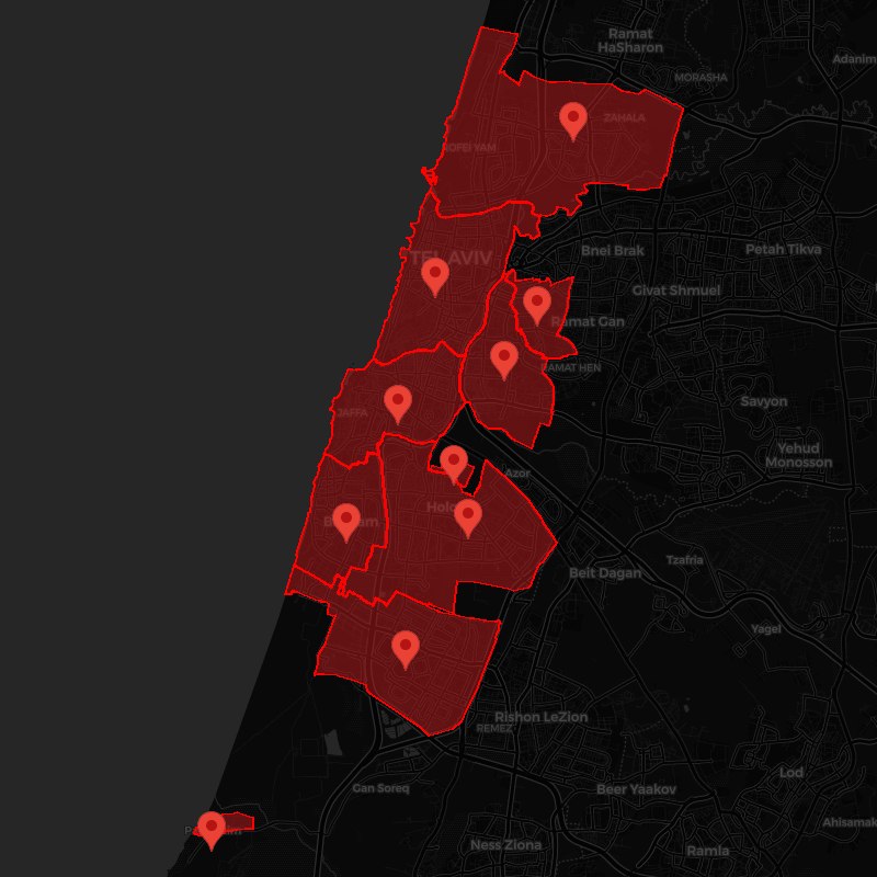 In Bnei Brak, a cluster munition impact at 05:08:13 UTC injured at least twenty civilians, according to rnintel. Similar incidents were reported in Tel Aviv and Petah Tikva, where cluster impacts caused fires and structural damage. The cumulative effect of these attacks generated a cascade of red alerts across the metropolitan area, as documented by the RocketAlert network, which logged more than thirty separate alerts between 05:00 and 23:00 UTC.