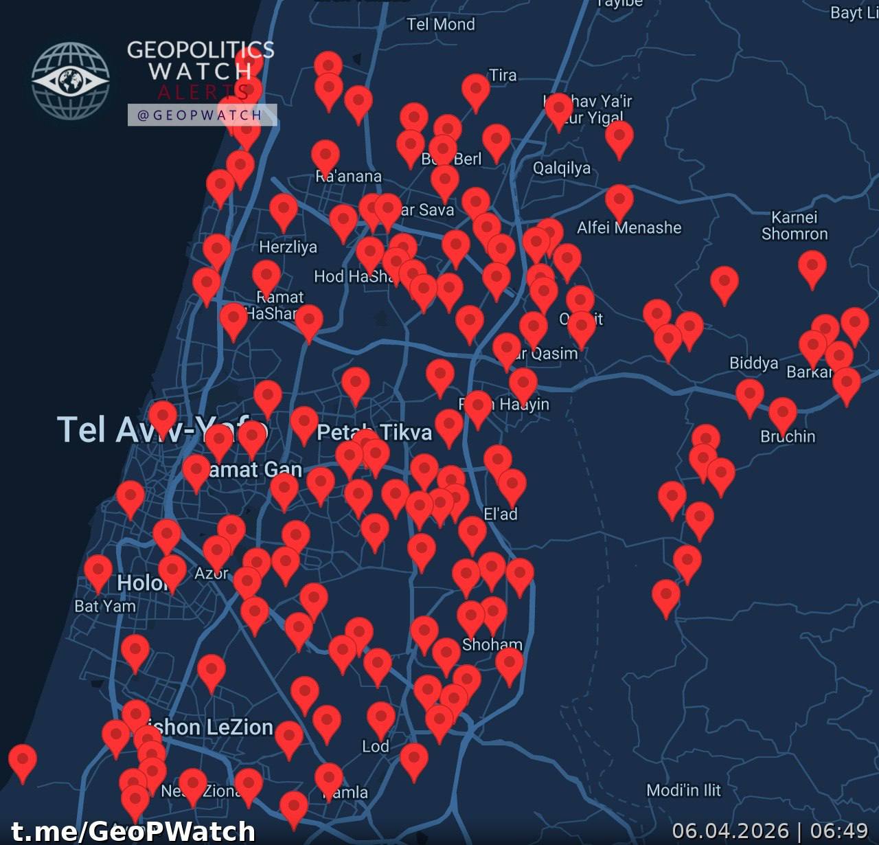 Between 04:06 and 04:18, a series of cluster munition impacts were recorded in central Israel. At 04:06:33, Israeli media identified fifteen distinct impact sites in the central district, described as an “unprecedented” pattern of shrapnel falls (rnintel, source: https://t.me/rnintel/58429). Shortly thereafter, at 04:06:14, the monitoring channel GeoPWatch logged seven separate impacts in Tel Aviv and surrounding neighborhoods (source: https://t.me/GeoPWatch/30706). An additional single impact was confirmed in Petah Tikva at 04:04:13 (source: https://t.me/GeoPWatch/30705). The cluster munition strike in Bnei Brak, an ultra‑orthodox suburb of Tel Aviv, was documented with a photograph at 04:03:46 (BellumActaNews, source: https://t.me/BellumActaNews/170285).
