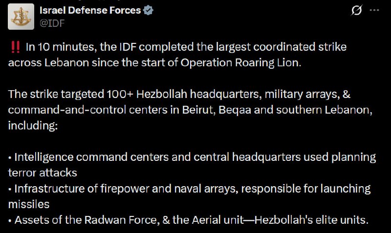 Israel conducted multiple large‑scale air campaigns against targets in Lebanon throughout the day. At 12:00 UTC, the Israeli military launched its largest coordinated strike against Hezbollah infrastructure, targeting approximately 100 command centres and associated assets (monitor_the_situation). Within ten minutes, the Israeli Air Force (IAF) deployed 160 bombs on 100 separate sites, a sortie described as the “Eternal Darkness” operation (GeoPWatch).