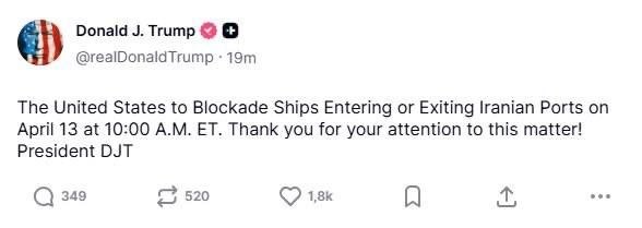 "Trump specified the exact time of the start of the blockade of Iranian ports. He stated that the naval blockade will begin at 17:00 Moscow time" – intelslava, 13 Apr 2026, https://t.me/intelslava/86486