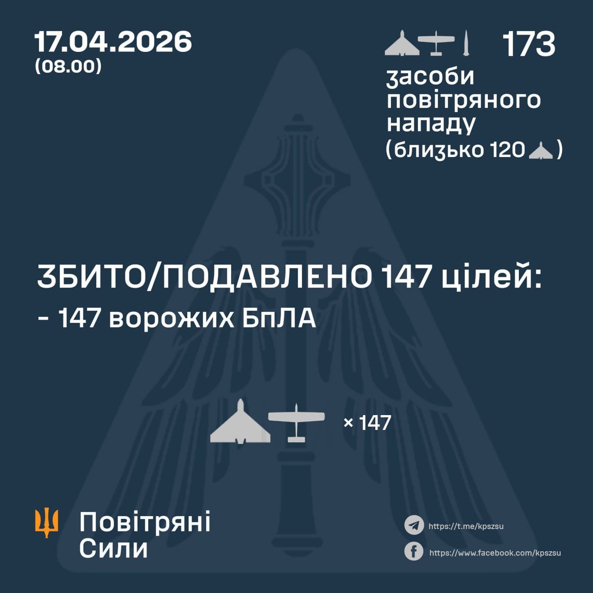 On the morning of 17 April 2026, Ukraine’s air‑defence forces reported a large‑scale Russian drone barrage targeting Kyiv and surrounding regions. According to the monitoring channel monitor_the_situation, Ukrainian systems shot down 147 of 173 unmanned aerial vehicles (UAVs), leaving 26 drones unaccounted for. The engagement underscores the intensity of the aerial contest and the growing reliance on UAVs by both belligerents.