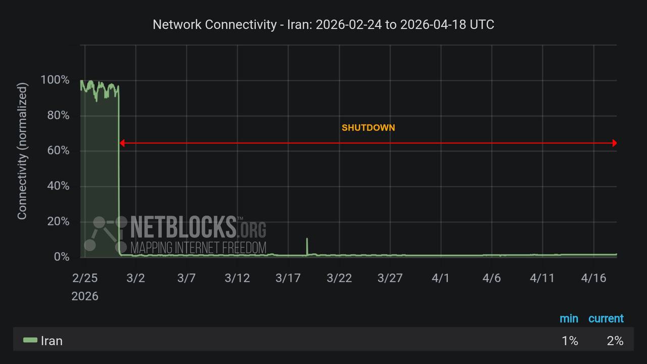 In addition to the maritime confrontations, Iran experienced a prolonged digital blackout, with the national internet cut off for 50 days, representing a non‑kinetic but strategically significant disruption to civilian communications.