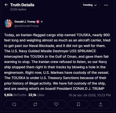 "United States President Donald Trump announced that US Navy intercepted, fired up and seized a Iranian cargo ship that tried to break the blockade on Iranian ports on the Gulf of Oman," the BellumActaNews post quoted.