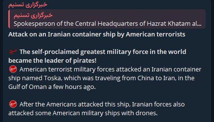 "IRGC forces have attacked some American military ships with drones following the seizure of an Iranian cargo ship by the US Navy," Tasnim News Agency quoted IRGC officials.