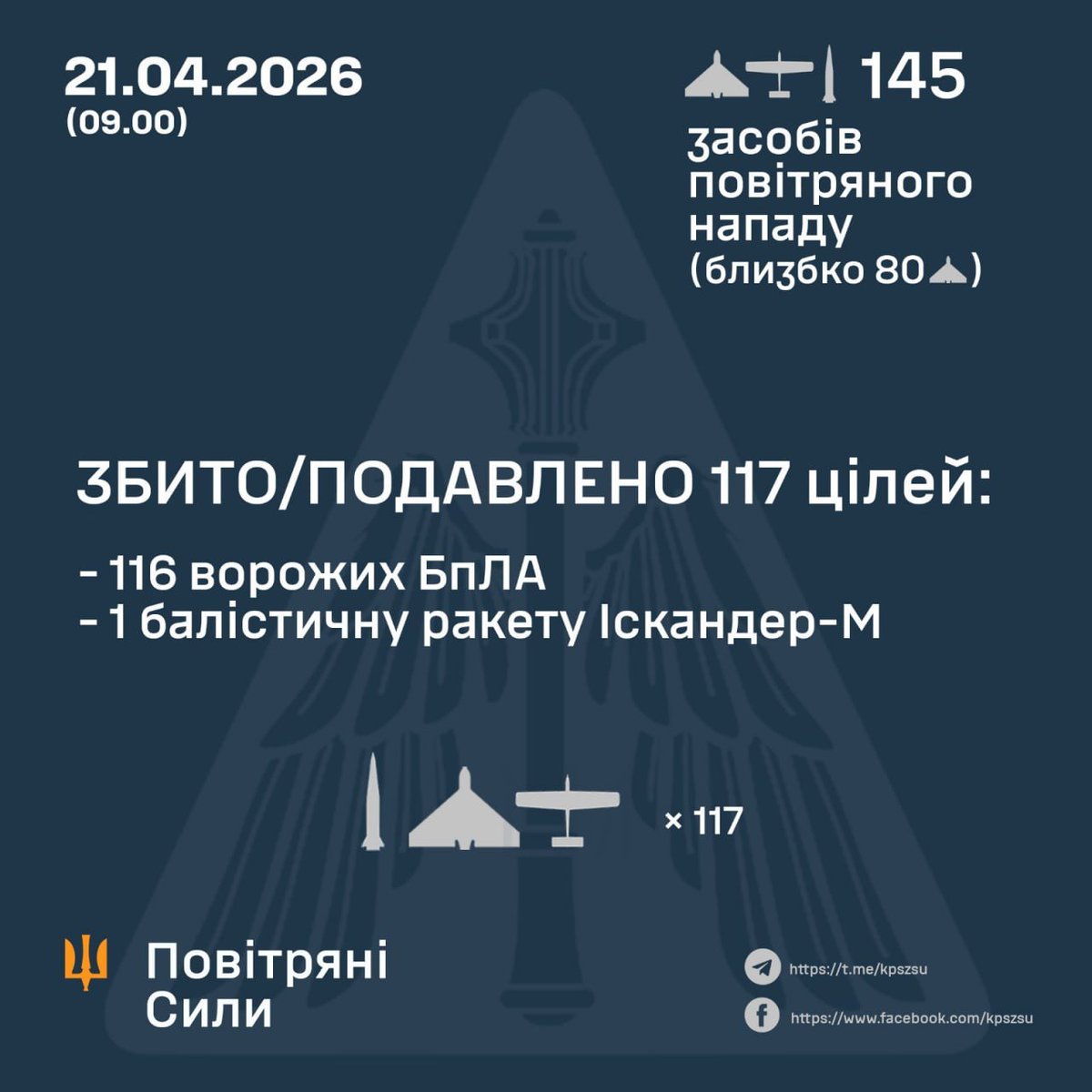 "Russian forces launched 143 drones overnight, with Ukrainian Air Force downing or jamming 116," – monitor_the_situation, 21 Apr 2026.