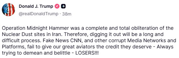 "American forces have obliterated all Iranian nuclear sites. Recovery of nuclear material is still required," the statement read.