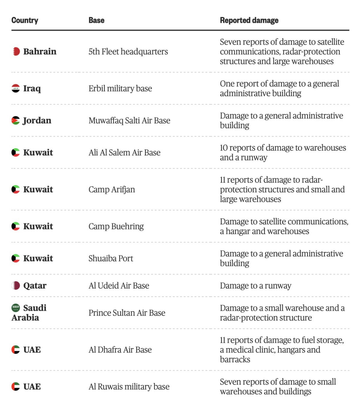Iranian air strikes on U.S. bases: Iranian IRIAF F‑5 fighter jets reportedly struck Camp Buehring in Kuwait, causing extensive damage to U.S. CENTCOM facilities. Similar attacks were reported at U.S. installations in Bahrain, Iraq, Jordan, Qatar, Saudi Arabia and the United Arab Emirates (Source: GeoPWatch, https://t.me/GeoPWatch/31871; Source: rnintel, https://t.me/rnintel/59844).