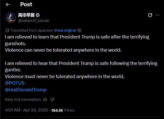 International leaders quickly expressed relief at the president’s safety. Japanese Prime Minister Sanae Takaichi posted a statement on the Telegram channel BellumActaNews, emphasizing that “violence can never be tolerated anywhere in the world” and confirming her relief that President Trump was unharmed (2026-04-26T04:32:20). The full quote is presented below: