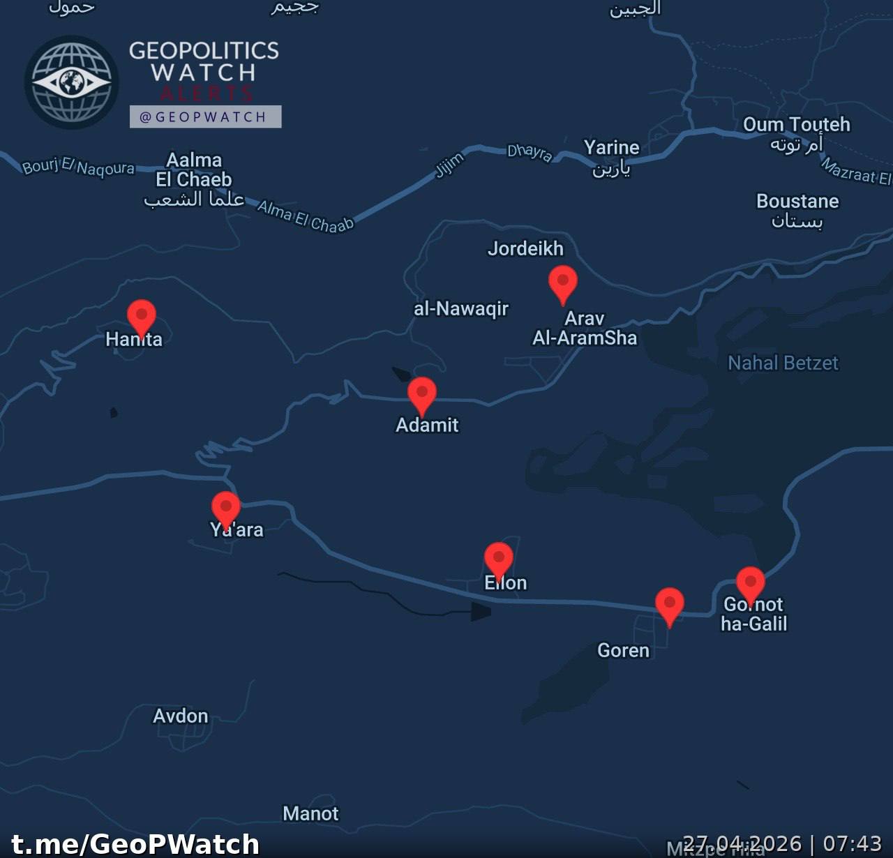 Earlier, at 05:00 UTC, the monitoring platform GeoPWatch documented a Hezbollah drone launch aimed at Israel’s western Galilee region. The drones were intercepted by Israeli air defenses, and no damage was recorded. A follow‑up alert at 05:06 UTC from rnintel noted additional drone sightings in the same sector, though details remained sparse.